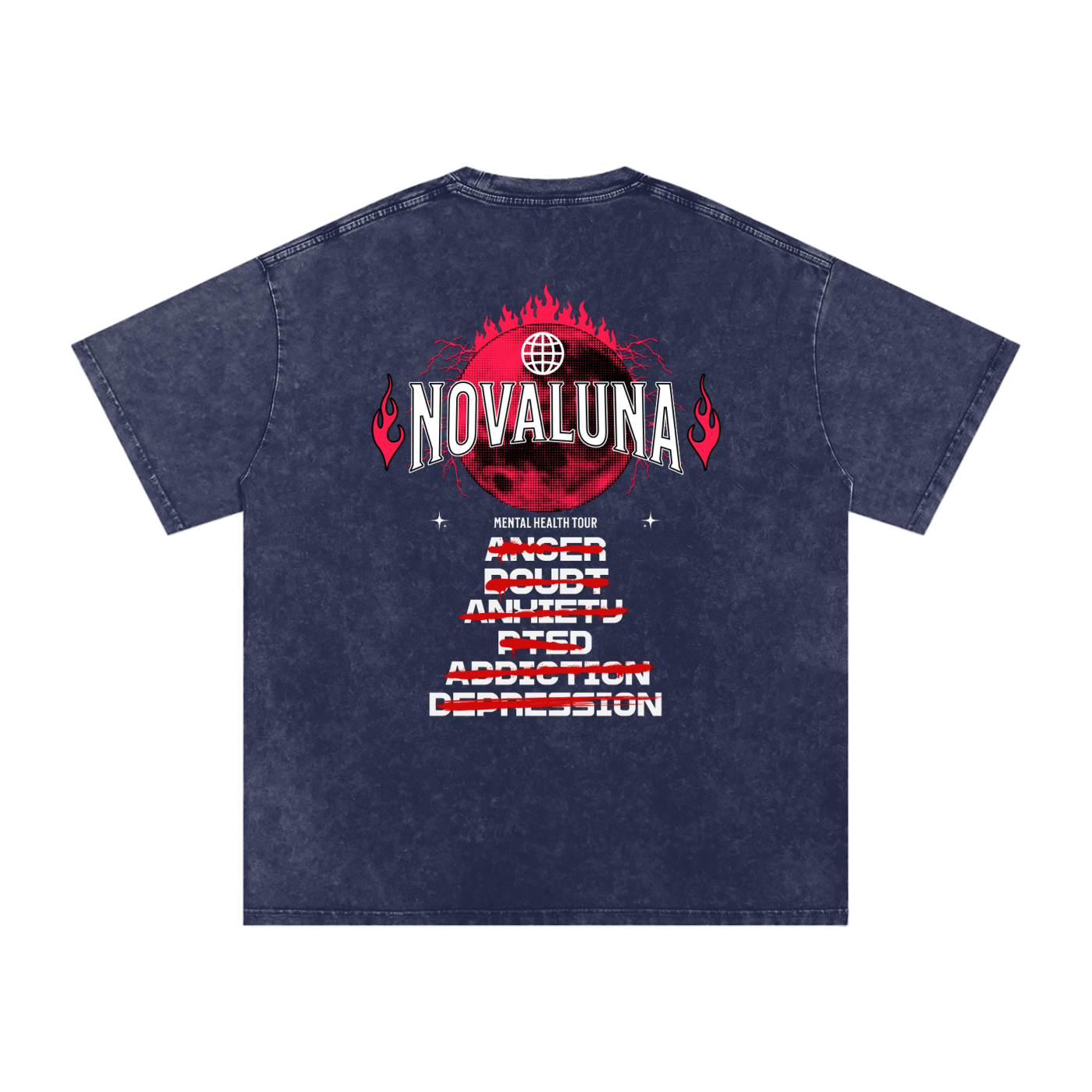 The VYSCENT × NovaLuna Mental Health Tour Tee represents the battle within and the power of confronting it head-on. Designed with a distressed, stone-washed black finish, this shirt blends raw streetwear energy with a deeper purpose.